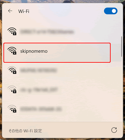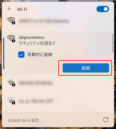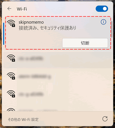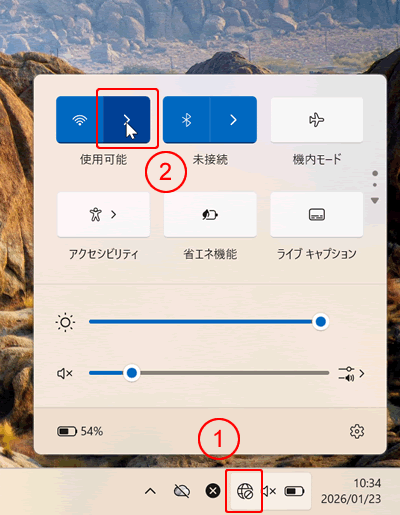 1通知領域にある「ネットワークアイコン」をクリックし、Wi-Fi接続の管理「>」をクリックする。