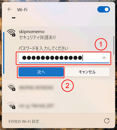 4メモしておいた「パスワード」を入力し、「次へ」をクリックする。