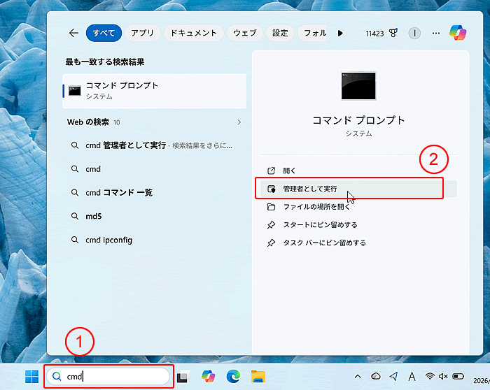 1タスクバーの検索に「cmd」と入力。