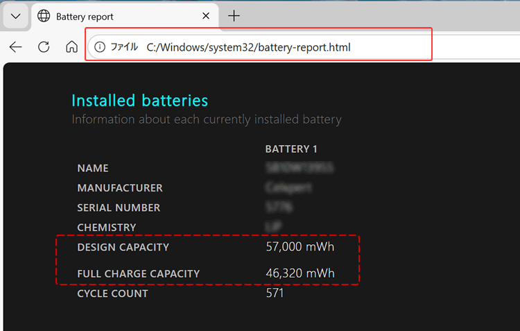 「DESIGN CAPACITY」が、新品時の容量。