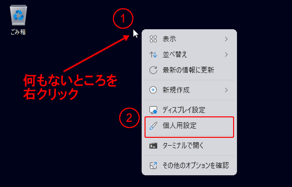 デスクトップの何もないところを右クリックし、「個人設定」をクリックします。